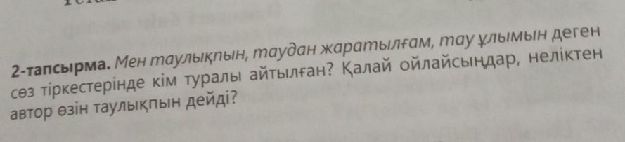 2-тапсырма. Мен таулықпын, таудан жаратылғам, тау ұлымын деген сөз тіркестерінде кім туралы айтылған? Қалай ойлайсыңдар, неліктен автор өзін таулықпын дейді?