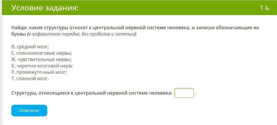 Найди, какие структуры относят к центральной нервной системе человека, и запиши обозначающие их буквы (в алфавитном порядке, без пробелов и запятых)