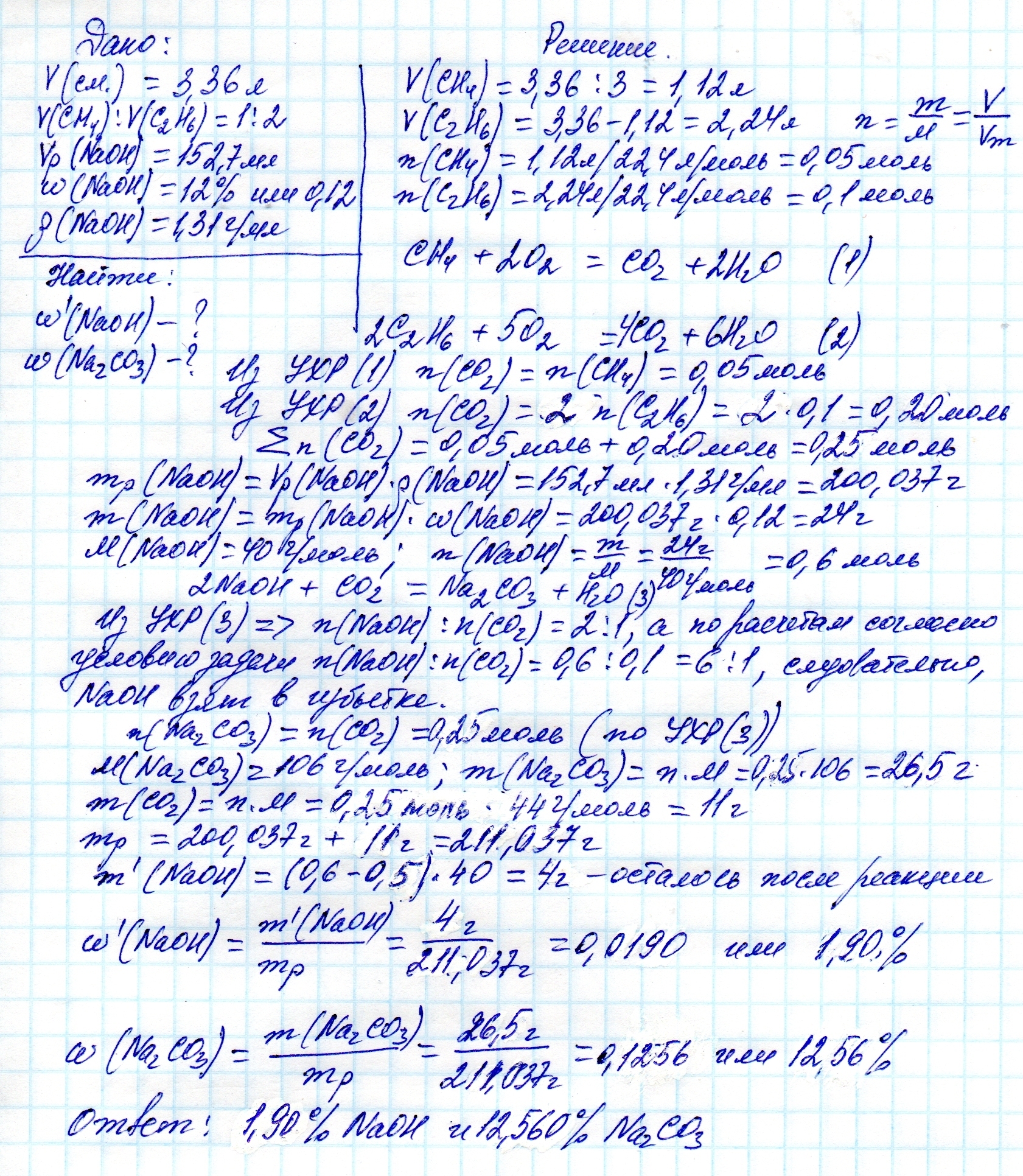 ПЛИЗ РЕШИТЕ!!! БАЛЛОВ НЕ ЖАЛЕЮ!!! Углекислый газ, полученный в результате полного сгорания 3,36 л (н.у.) смеси метана и этана, в которой объемное соотношение газов равно 1:2, пропустили через раствор гидроксида натрия объемом 152,7 мл с массовой долей NaOH 12% (плотность 1,31 г/мл). Определите массовые доли веществ в полученном растворе. Запишите решение задачи (по действиям) и ответ.