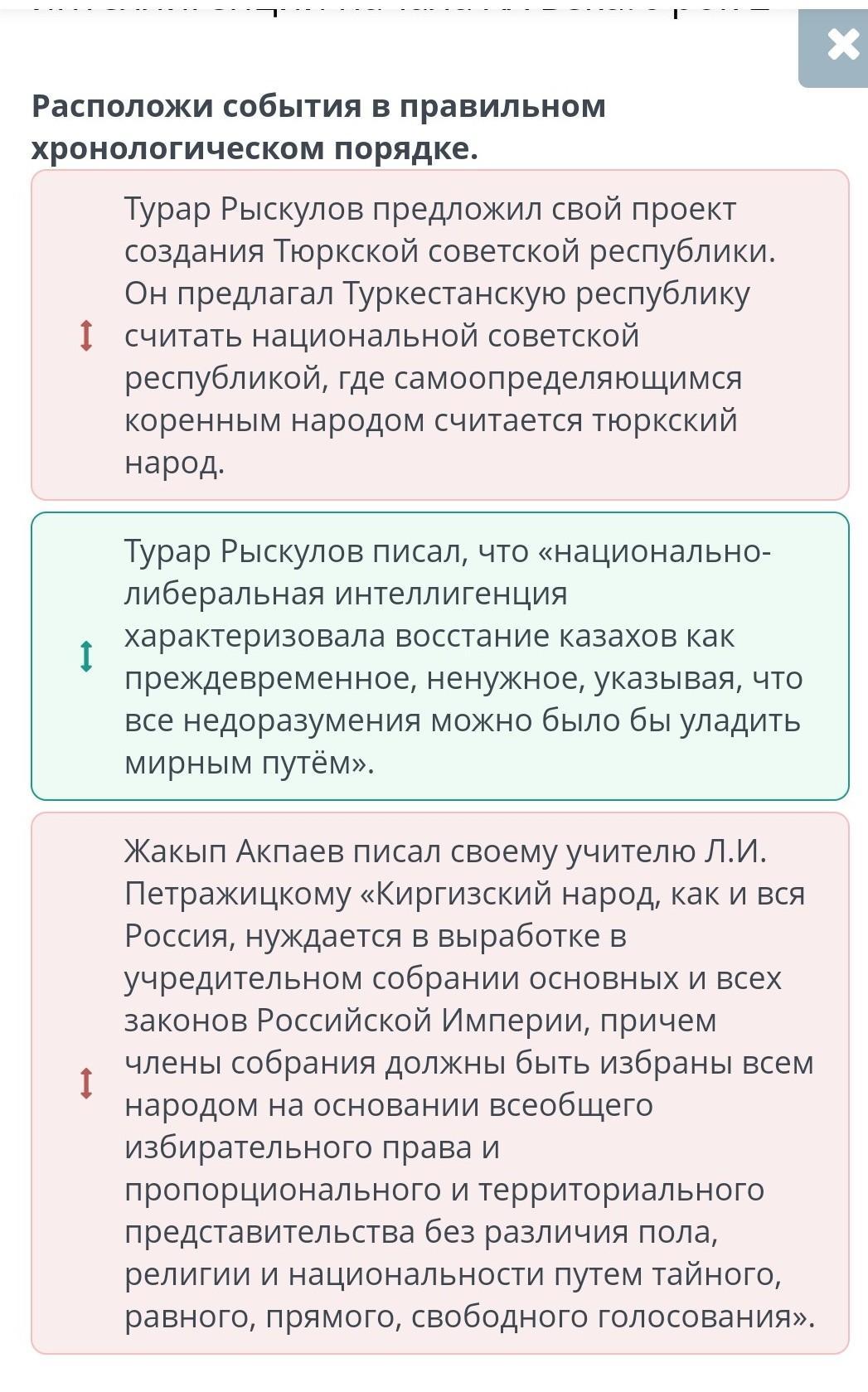Расположи события в правильном хронологическом порядке. І Турар Рыскулов Писал, что «национально- Либеральная интеллигенция характеризовала восстание казахов как преждевременное, ненужное, указывая, что все недоразумения можно было бы уладить Мирным путём». Турар Рыскулов предложил свой проект создания Тюркской советской республики. Он предлагал Туркестанскую республику І считать национальной советской республикой, где самоопределяющимся коренным народом считается тюркский народ. І Жакып Акпаев Писал своему учителю Л.И. Петражицкому «Киргизский народ, как и вся Россия, нуждается в выработке в учредительном собрании основных и всех законов Российской Империи, причем члены собрания должны быть избраны всем народом на основании всеобщего избирательного права и пропорционального и территориального представительства без различия пола, религии и национальности путем тайного, равного, прямого, свободного голосования». А помогите плиз