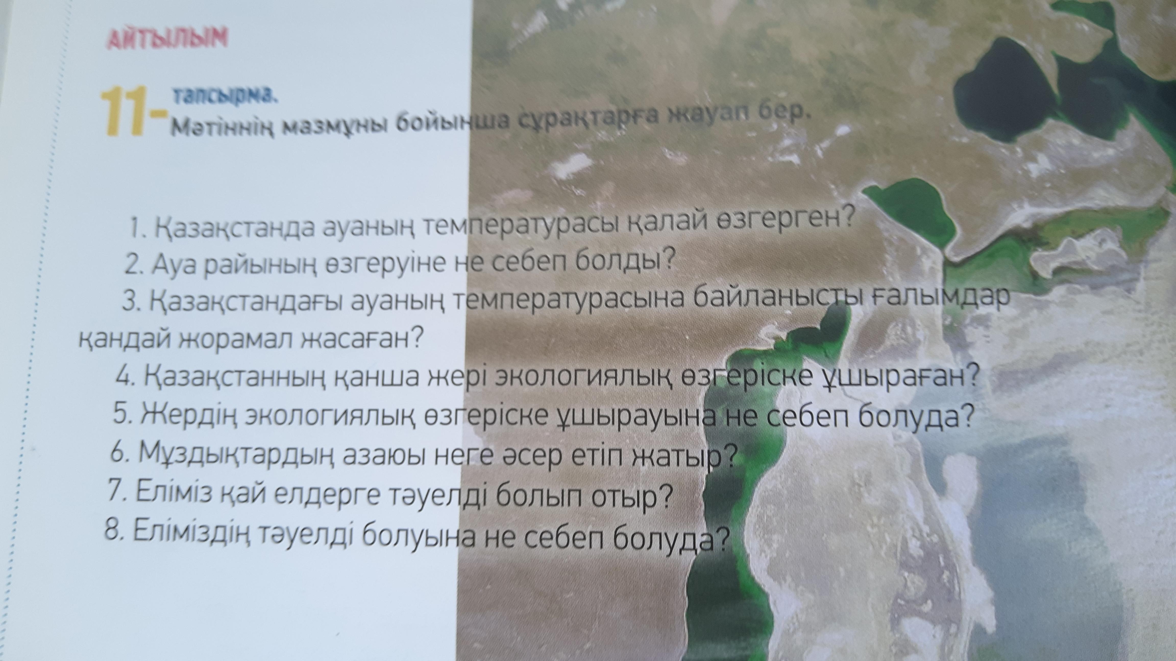3. Қазақстандағы ауаның температурасына байланысты ғалымдар <<күн осылай жылына берсе, 21 ғасырдың ортасында орташа температура Цельсий бойынша 6 градусқа көтерілуі мүмкін>> деп жорамал жасаған.