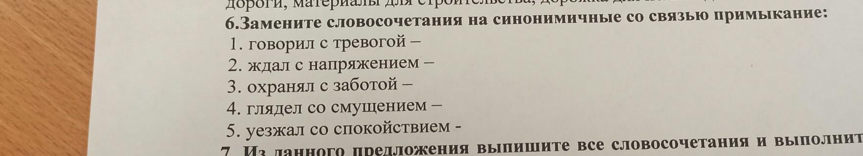 Примыкание: 1) говорил тревожно; 2) ждал напряжённо; 3) охранял заботливо; 4) глядел смущённо; 5) уезжал спокойно.