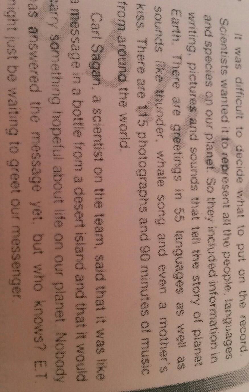 Было трудно решить, что включить в запись. ученые хотели, чтобы он представлял всех людей, языки и виды на нашей планете. поэтому они включили информацию в wnting, картинки и звуки, рассказывающие историю планеты эрх, приветствия на 55 языках, а также звуки, такие как гром, песня кита и даже поцелуй матери. здесь 115 фотографий и 90 минут музыки со всего мира. кари саган, ученый из команды, сказал, что это было похоже на послание в бутылке с необитаемого острова и что это принесет что-то обнадеживающее о жизни на нашей планете, пока никто не ответил на сообщение, но кто знает? т. е. мы просто ждем, чтобы поприветствовать нашего посланника.