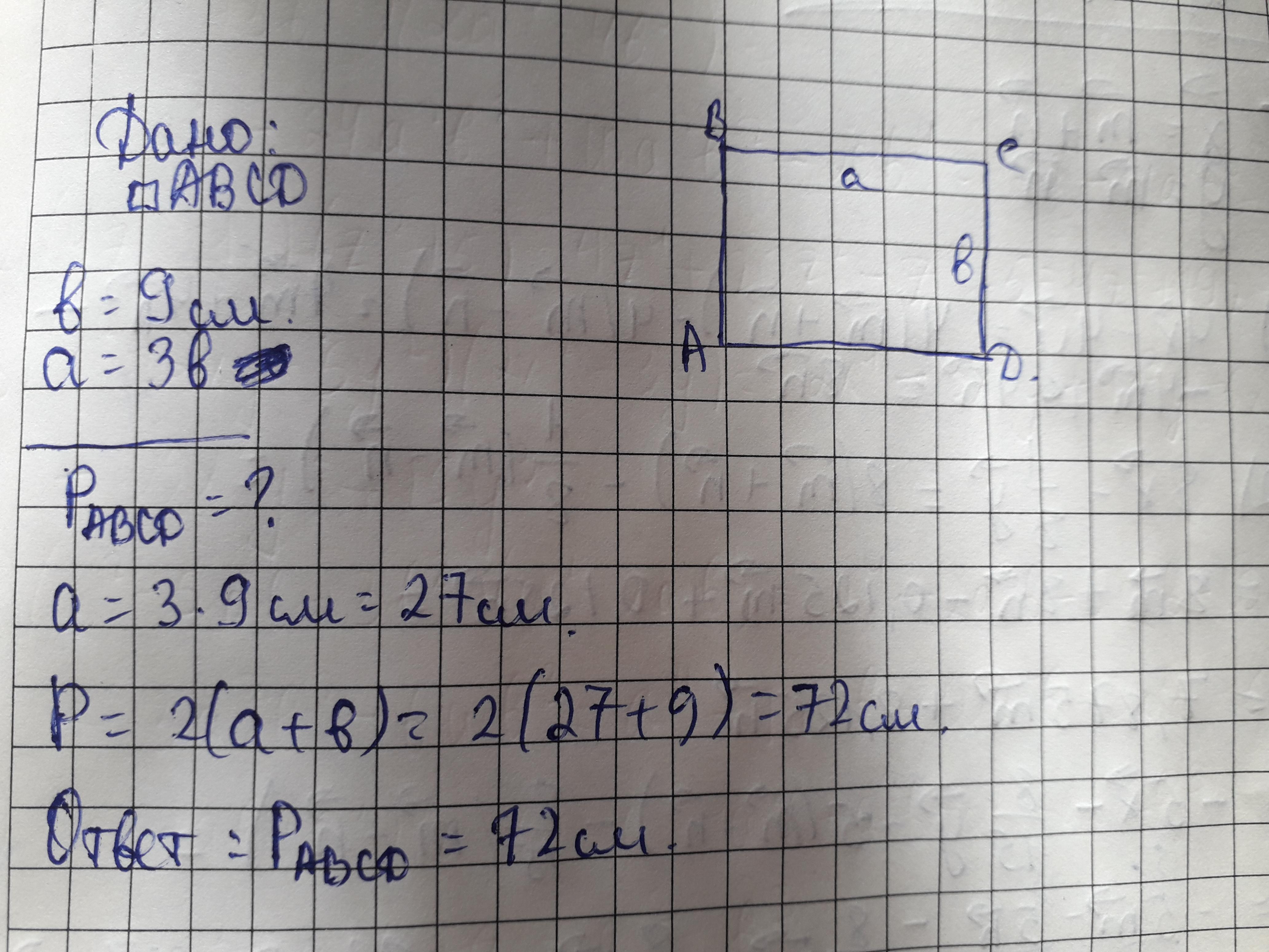 одна из сторон прямоугольника равна 9 см а другая в три раза больше Найди периметр прямоугольника