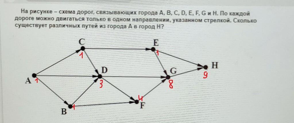 На рисунке — схема дорог, связывающих города А, В, С, D, E, F, Gи Н. По каждой дороге можно двигаться только в одном направлении, указанном стрелкой. Сколько существует различных путей из города Ав город Н? С E H D С A F B