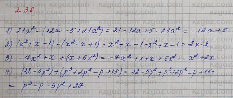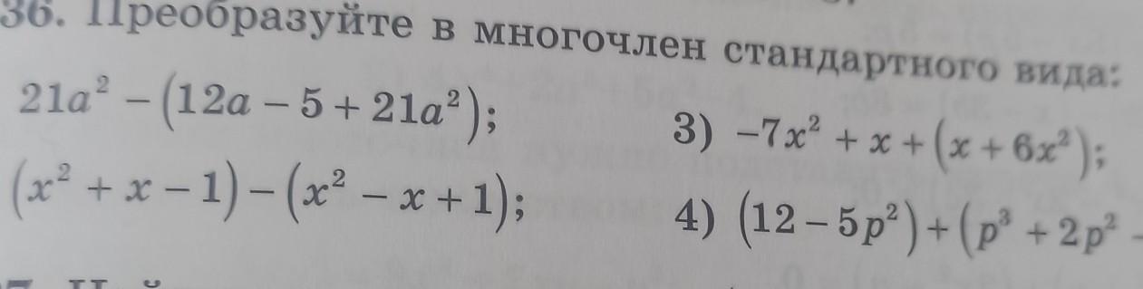 2.36. Преобразуйте в многочлен стандартного вида: 1) 21а" - (12а – 5+ 21а”); 3) -7x* + x + (x + 6x²); + 2) (xº + x - 1) - (x2 - x + 1); – 4) (12 – 5p° ) + (p + 2р” -р+15). х -
