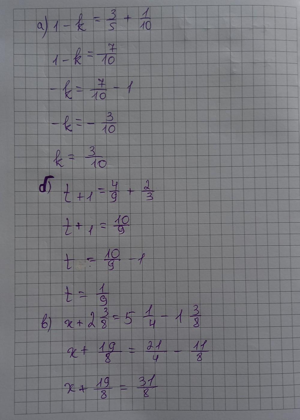 421. Решите уравнение: А) 1-k=3/5+1/10; Б) t+1=4/9+2/3; В) x+2целых3/8=5целых1.4-1целая3/8. пж помогите