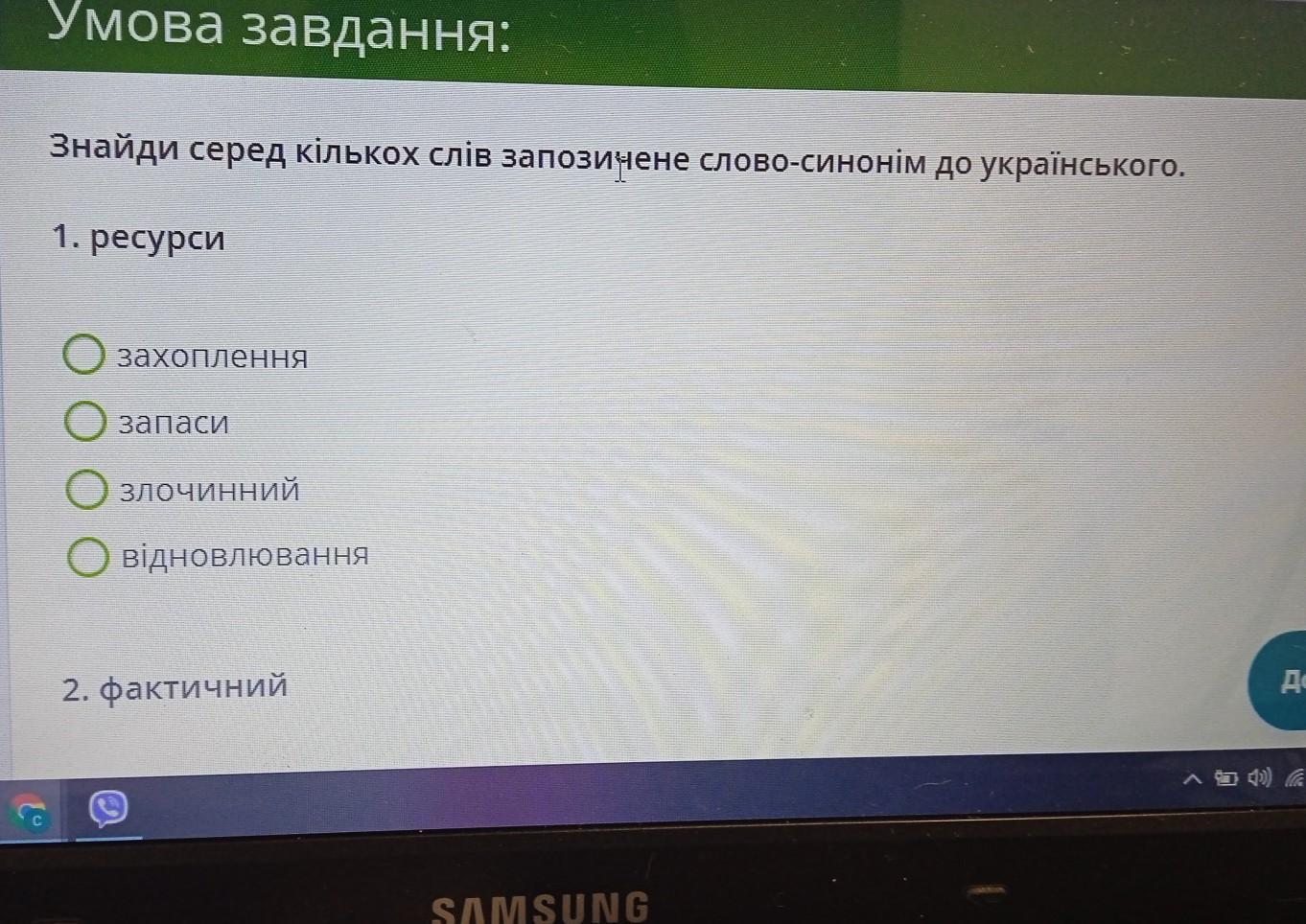 Умова завдання: Знайди серед кількох слів запозичене слово-синонім до українського 1. ресурси Озахоплення, Озапаси Озлочинний відновлювані