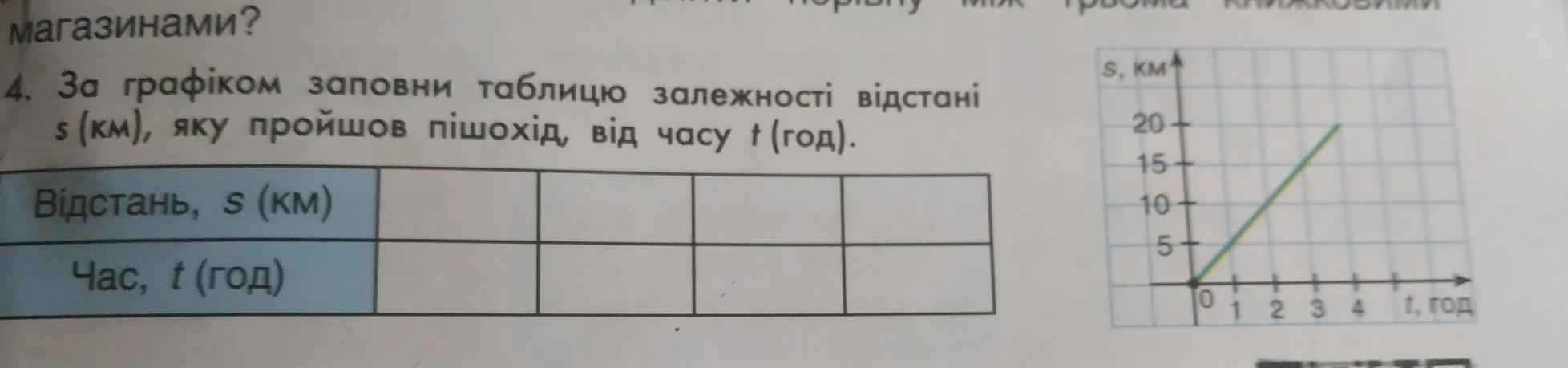 За графіком заповни таблицю залежності відстані s (км), яку пройшов пішохід, від часу t (год).