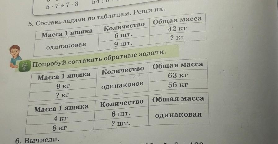 5. Составь задачи по таблицам. Реши их. Общая масса 42 кг 2 кг Количество 6 шт. 9 шт. Масса 1 ящика одинаковая Попробуй составить обратные задачи. Общая масса Количество Масса 1 ящика 63 кг 56 кг 9 кг ? кг одинаковое Общая масса Количество Масса 1 ящика 4 кг 6 шт. 2 шт. одинаковая 8 кг в вычисли.