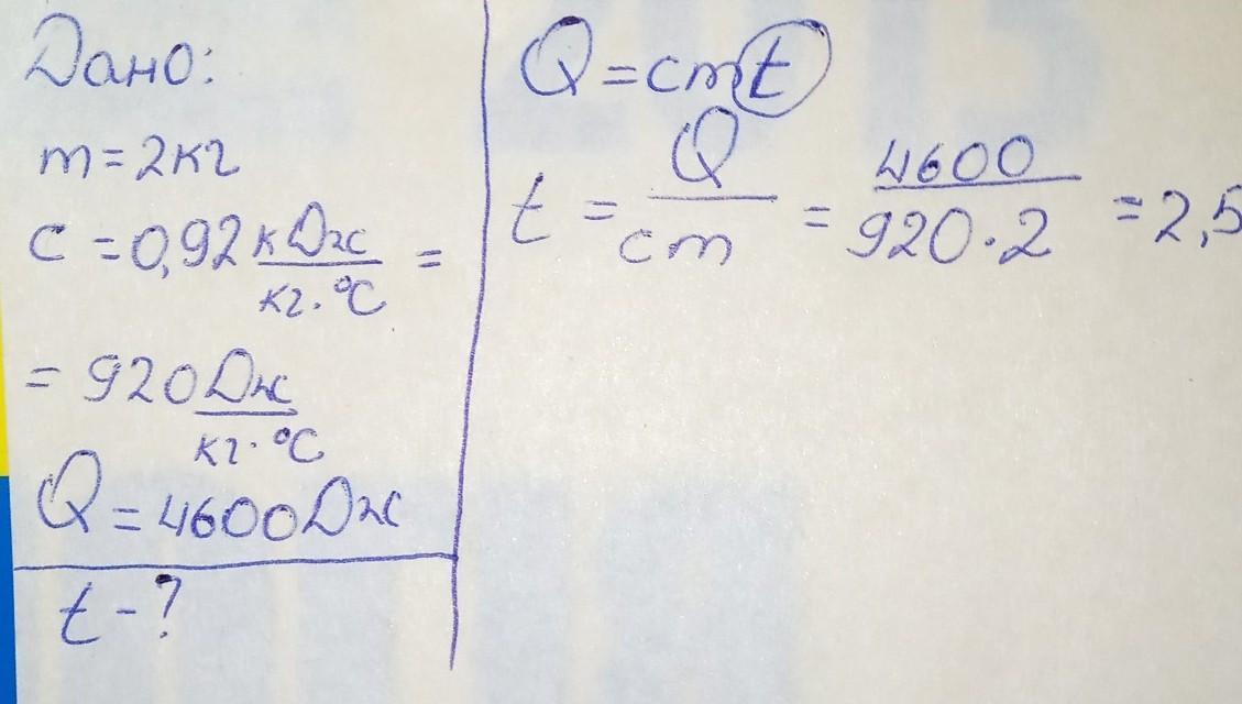 На скільки градусів нагрівається 2 кг алюмінію з питомою теплоємністю 0,92 кДж/кг·0С при затраті 4600 Дж теплоти? С дано.