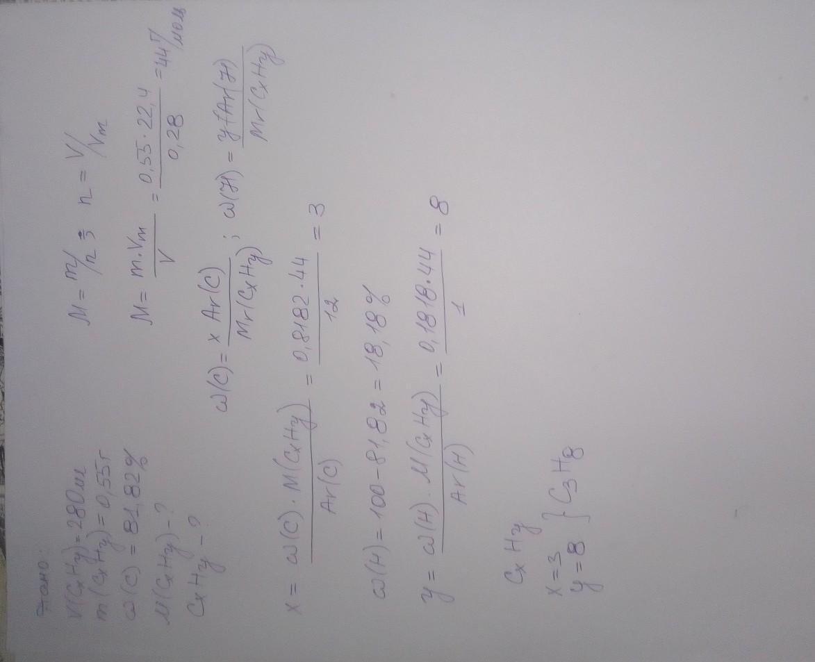 Помогите с решением!Масса 280мл газообразного углеводорода равна 0.55 гр при н.у..Массовая доля углерода в веществе 81.82 %.Найти молекулярную формулу углеводорода