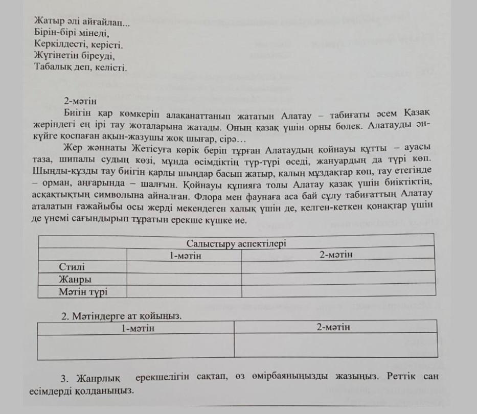 1. Мәтіндерді оқып, стилiн, жанрын салыстырыныз. 1-мәтiн Ботенке, Шужык, Балкаймак, Дүкенде тұрып ұрысты. Батенке шыкты айгайлап: Айту керек дурысты! Сен екеуiн кiмсiндер. Менi айтындар мулiк деп, Кур мактанып журсiндер. Журт та сырттан күлiп кеп. ...Бiлмейсіндер, өмірге Кiм пайдалы, кім мыкты, Кәне, екеуiн жеңiл де, Мойындандар шындыкты. ...Таласты олар узак тун, ...Кеттi айтыс узап тым, Бiр бiтiмге келмеді... Бакта оянды әншi кус. Ай да калгып барады. Шымкай тартты кун шыгыс. Алтын арай тарады. Ботенке, Шужык, Балкаймак,