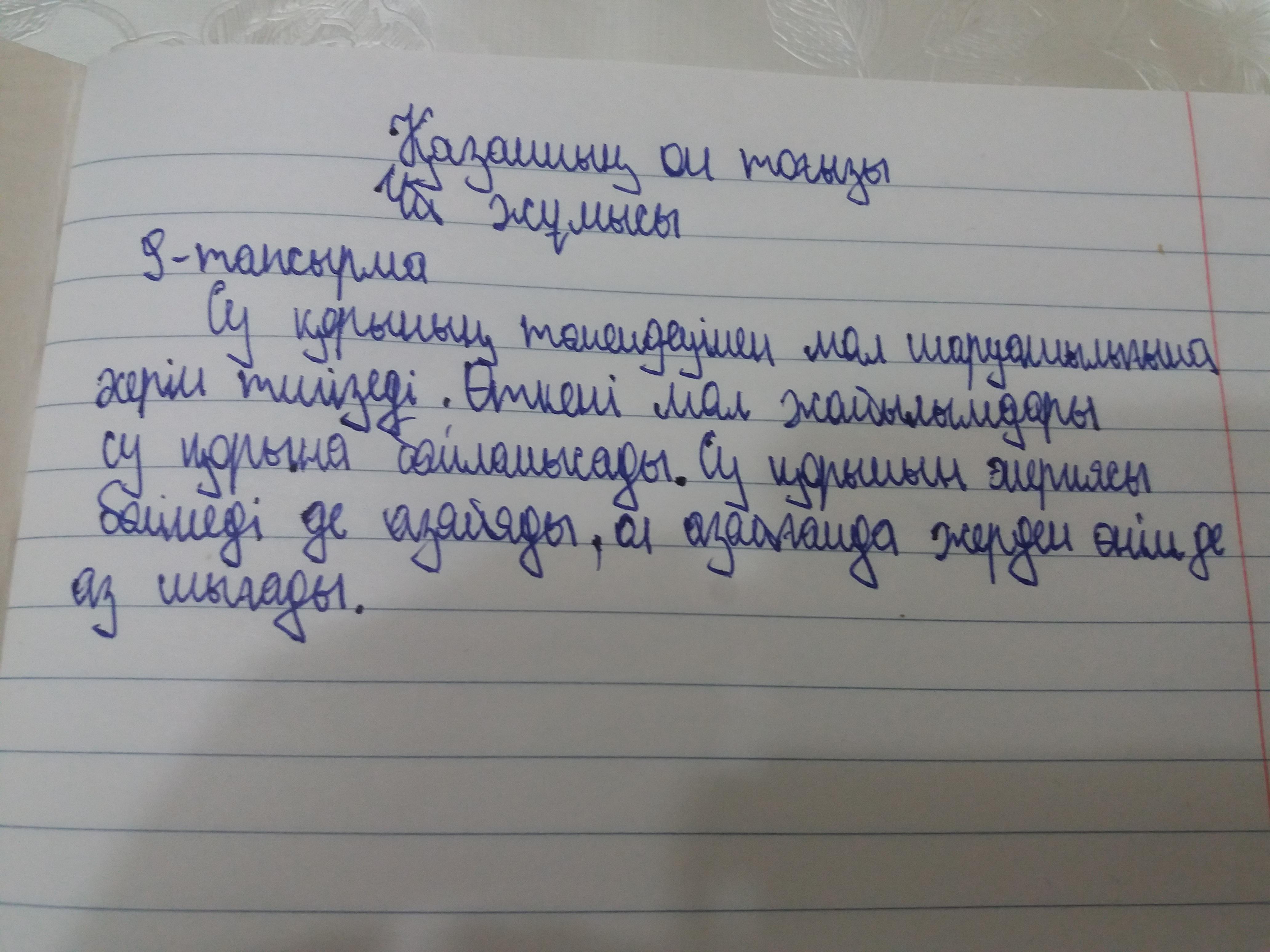 Диалогтегі 4 үнқатымды монолог айналдырып жаз. Үлгі: Диалог: Алуа: — Су қорының төмендеуі ауыл шаруашылығына әсер ете ме? Дана: - Әрине, Алуа. Су қорының төмендеуінен мал жайылымдары тозады. Ол ауыл шаруашылығына да кері әсер етеді. Алуа: Рақмет. Сенен көп мәлімет алдым. Сонда энергияның көп бөлінуінен жердегі су қоры азаяды екен. Су азайса, жерден өнім шықпайды. Монолог: Су қорының төмендеуінен мал жайылымдары тозады. Су қорының төмендеуі ауыл шаруашылығына да кері әсер етеді. Энергияның көп бөлінуінен жердегі су қоры азаяды. Су азайғанда жерден өнім шықпайды