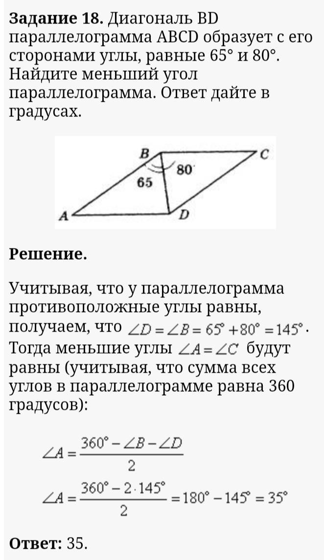 равные 65° и 80°. Найдите меньший угол этого параллелограмма. Отве