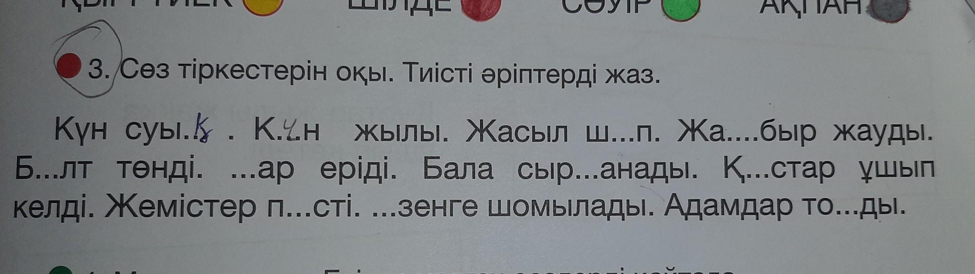Күн суық. Күн жылы. Жасыл шөп. Жаңбыр жауды. Бұлт төнді. Қар ереді. Бала сырғанады. Құстар ұшып келді. Жемістер пісті. Өзенге шомылады. Адамдар тоңды.