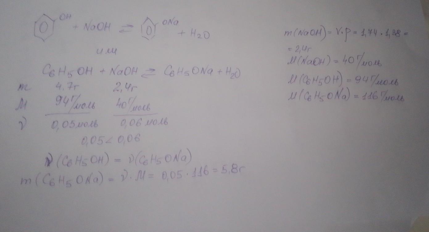 Яку масу натрій феноляту можна одержати при взаємодії 4,7 г фенолу з розчином натрій гідроксиду об'ємом 1,74 мл і густиною 1,38 г/мл.