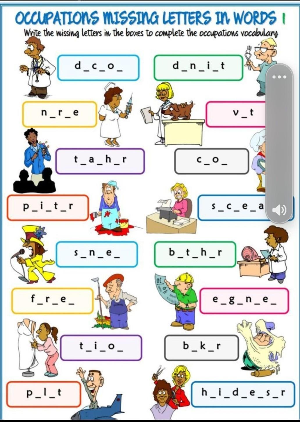 doctor, dentist, nurse, vet, teacher, cook, painter, secretary, singer, butcher, farmer, engineer, tailor, baker, pilot, hairdresser