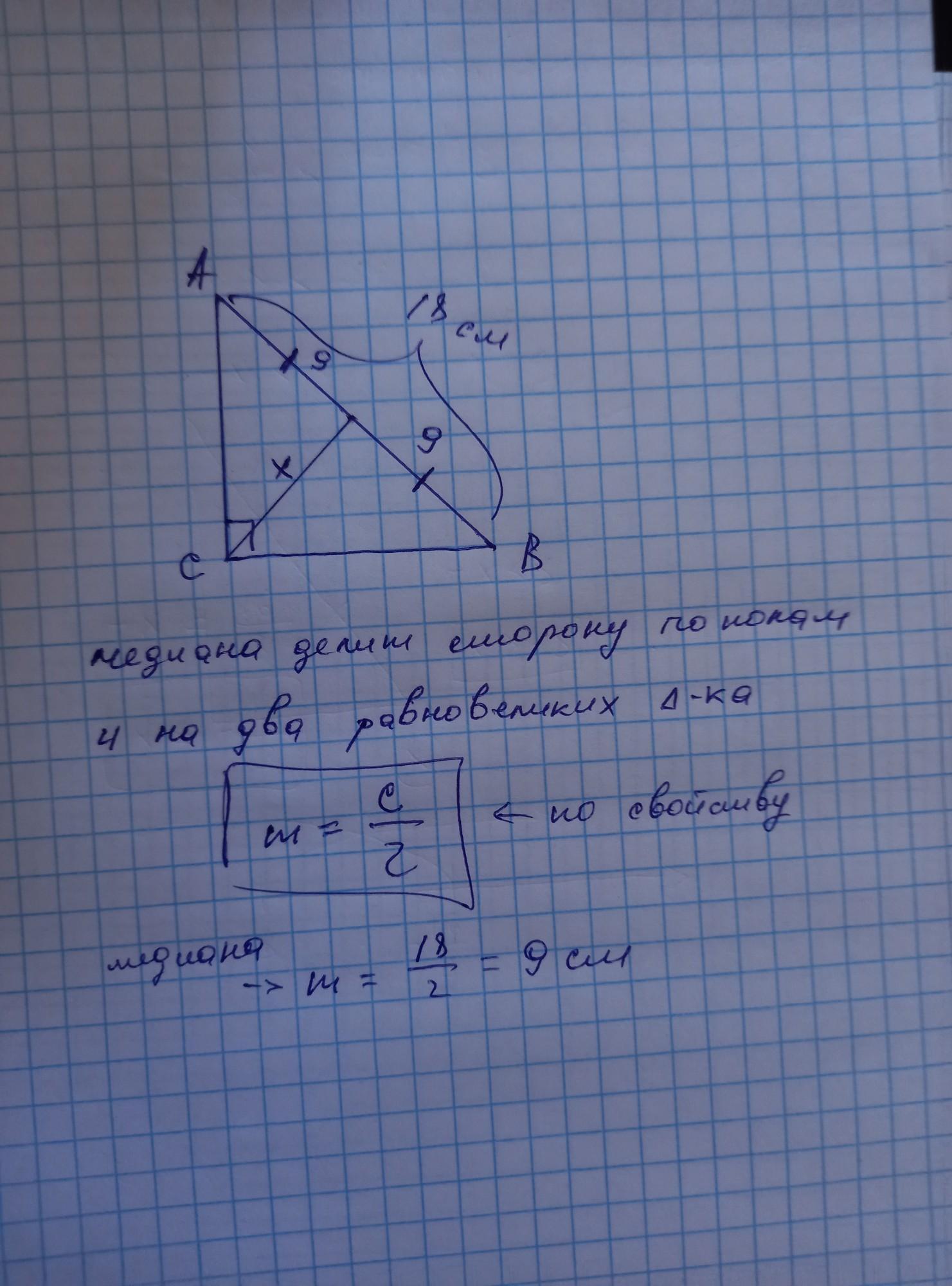 2. Найдите медиану прямоугольного треугольника, проведенную к гипотенузе, если гипотенуза равна 18.
