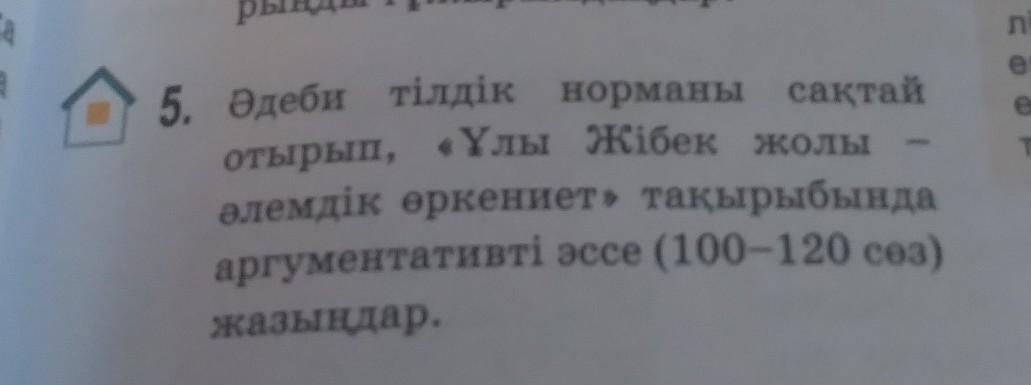 5. Әдеби тілдік норманы сақтай отырып, «Ұлы Жібек жолы әлемдік өркениет» тақырыбында аргументативті эссе (100-120 сөз) жазыңдар.