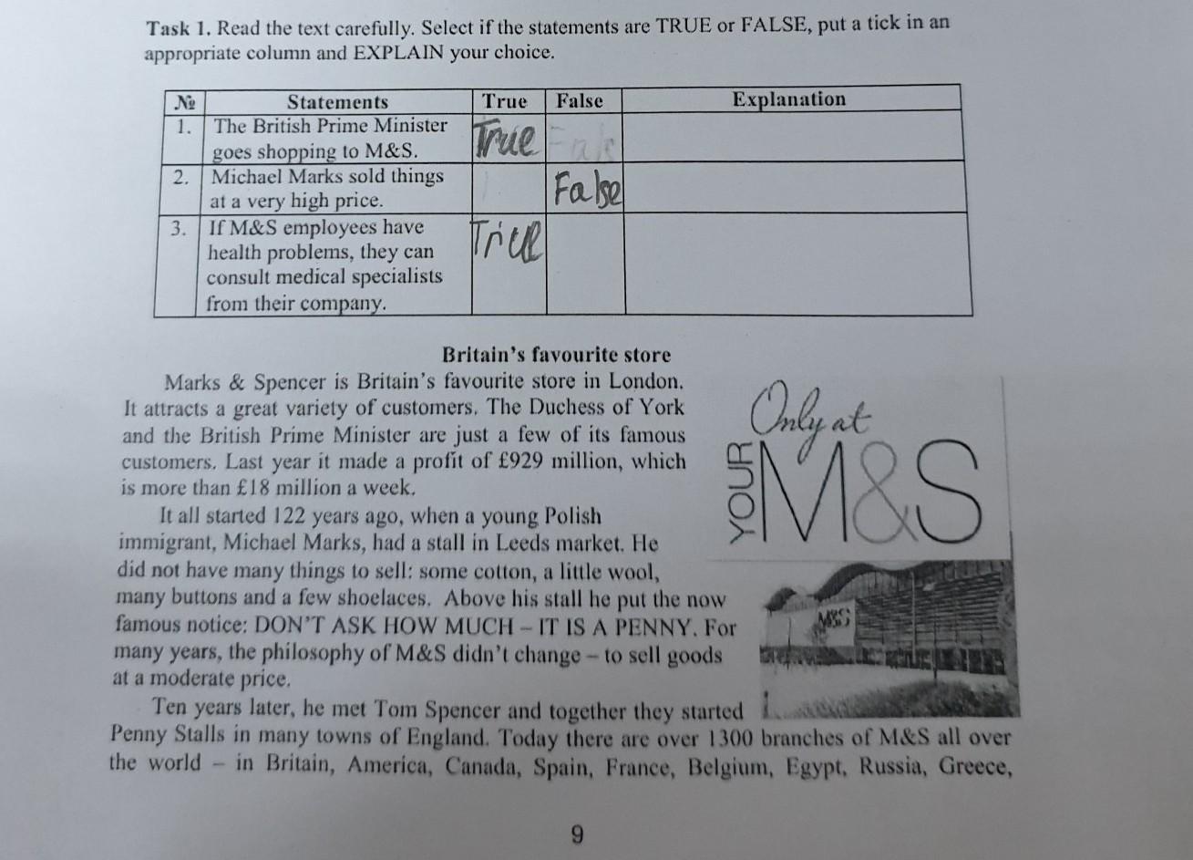Task 1. Read the text carefully. Select if the statements are TRUE or FALSE, put a tick in an appropriate column and EXPLAIN your choice. True False Explanation True No Statements 1. The British Prime Minister goes shopping to M&S. 2. Michael Marks sold things at a very high price. 3. If M&S employees have health problems, they can consult medical specialists from their company.