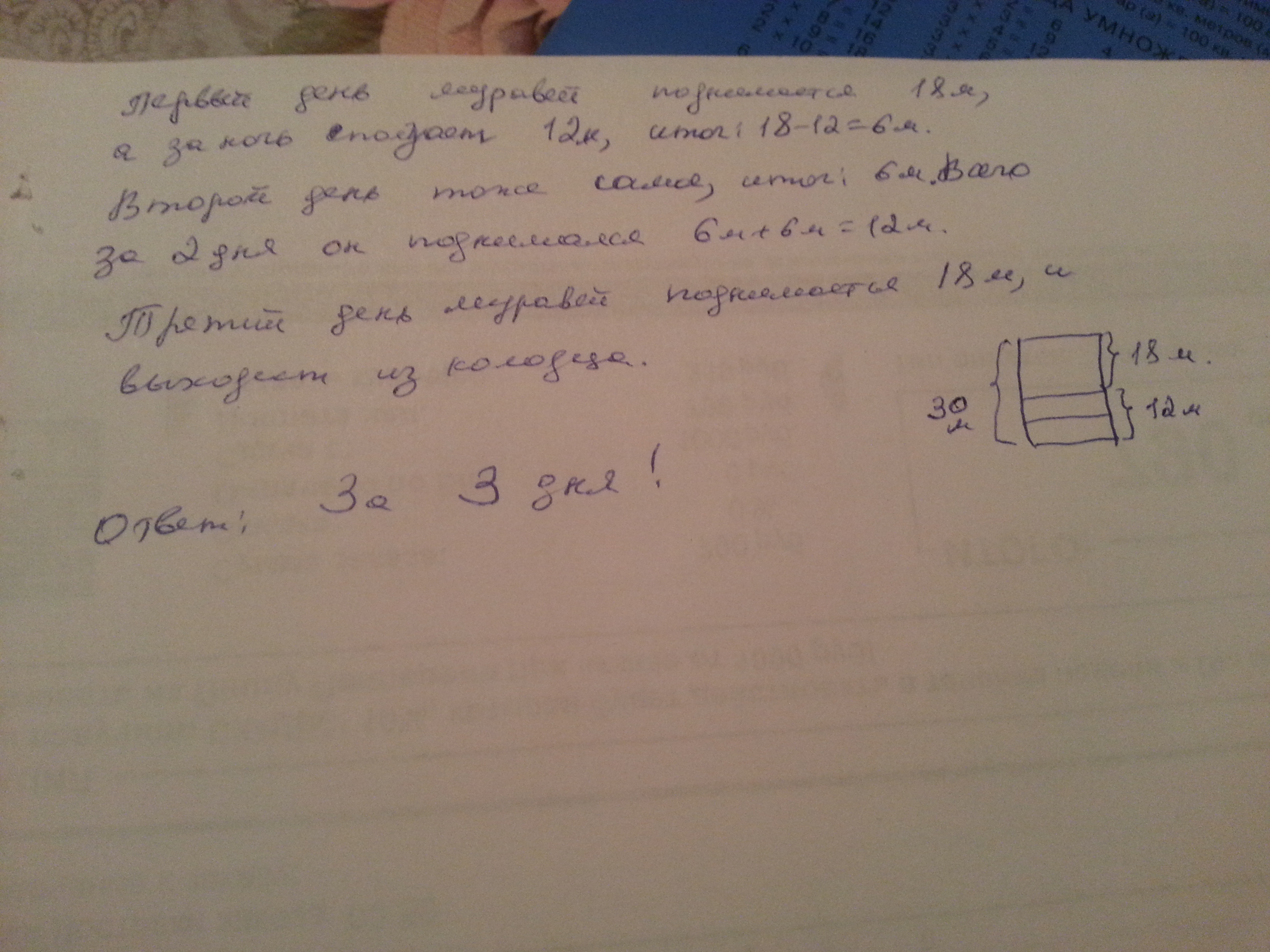 Муравей находится на дне колодца глубиной 30 м. За день он поднимается на 18 м, а за ночь сползает вниз на 12 м. Сколько дней нужно муравью, чтобы выбраться из колодца?