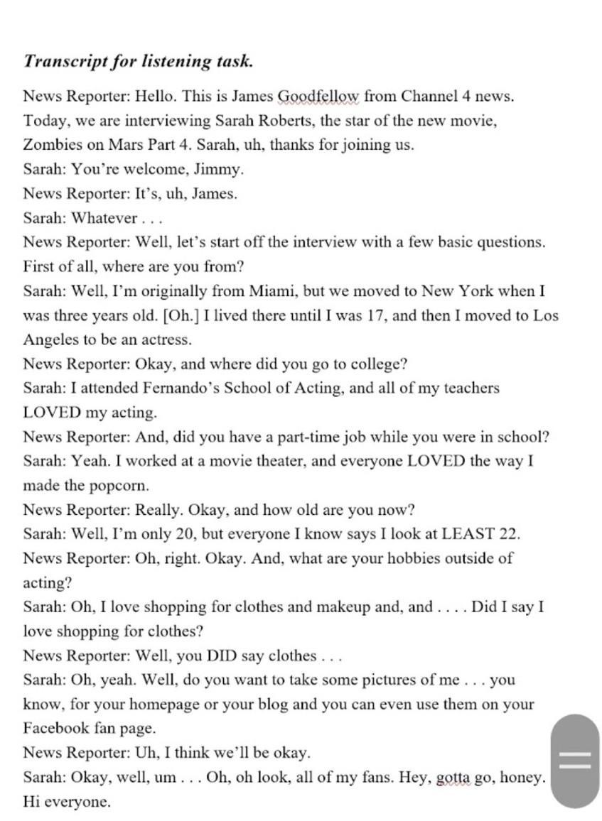 Listening Task 1. Listen and read the phone message and answer the questions. 1. What is the name of the actress? *