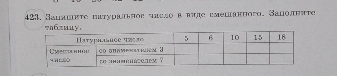 423. Запишите натуральное число в виде смешанного. Заполните таблицу. Натуральное число 5 6 10 15 18 Смешанное со знаменателем 3 число со знаменателем 7