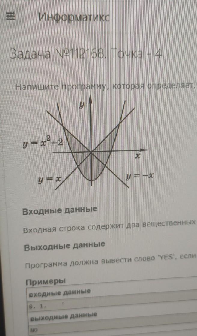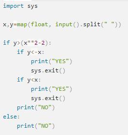 Входные данные: Входная строка содержит два вещественных числа – координаты точки на плоскости (сначала х -координата, затем – у-координата). Выходные данные: Программа должна вывести слово "YES', если точка попала в заштрихованную область, и слово "NO", если не попала. На питоне. Ответ.