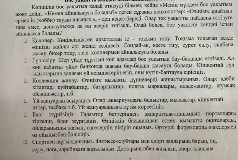 қатыстық: бос уақытын, ұнайтын, оң әсерін, көңілсіздіктен, өсіру,
