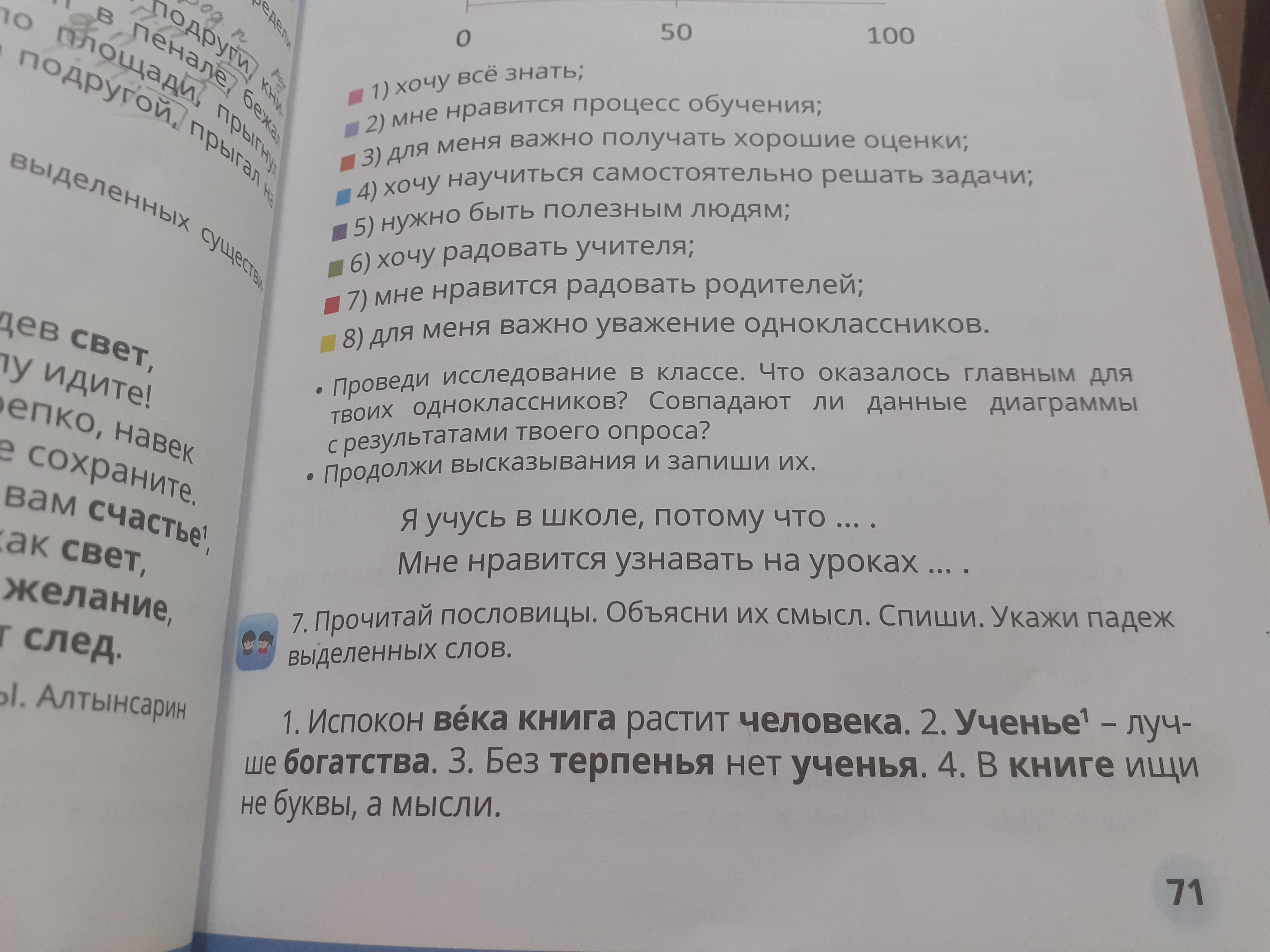 века книга(И.п),человека(р.п),богатства(И.п),терпенья(Р.п),ученья(Д.п),книге(И,.п)1 предл.значит,книни дают человеку образование.2 предл.то что ученье заменяет все погадтсва,3 предл.то что в книге много интересного
