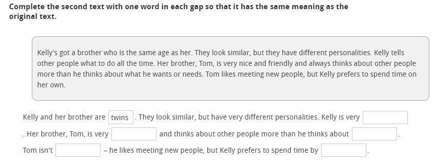 1. bossy 2. kind 3. himself 4. an introvert 5. herself