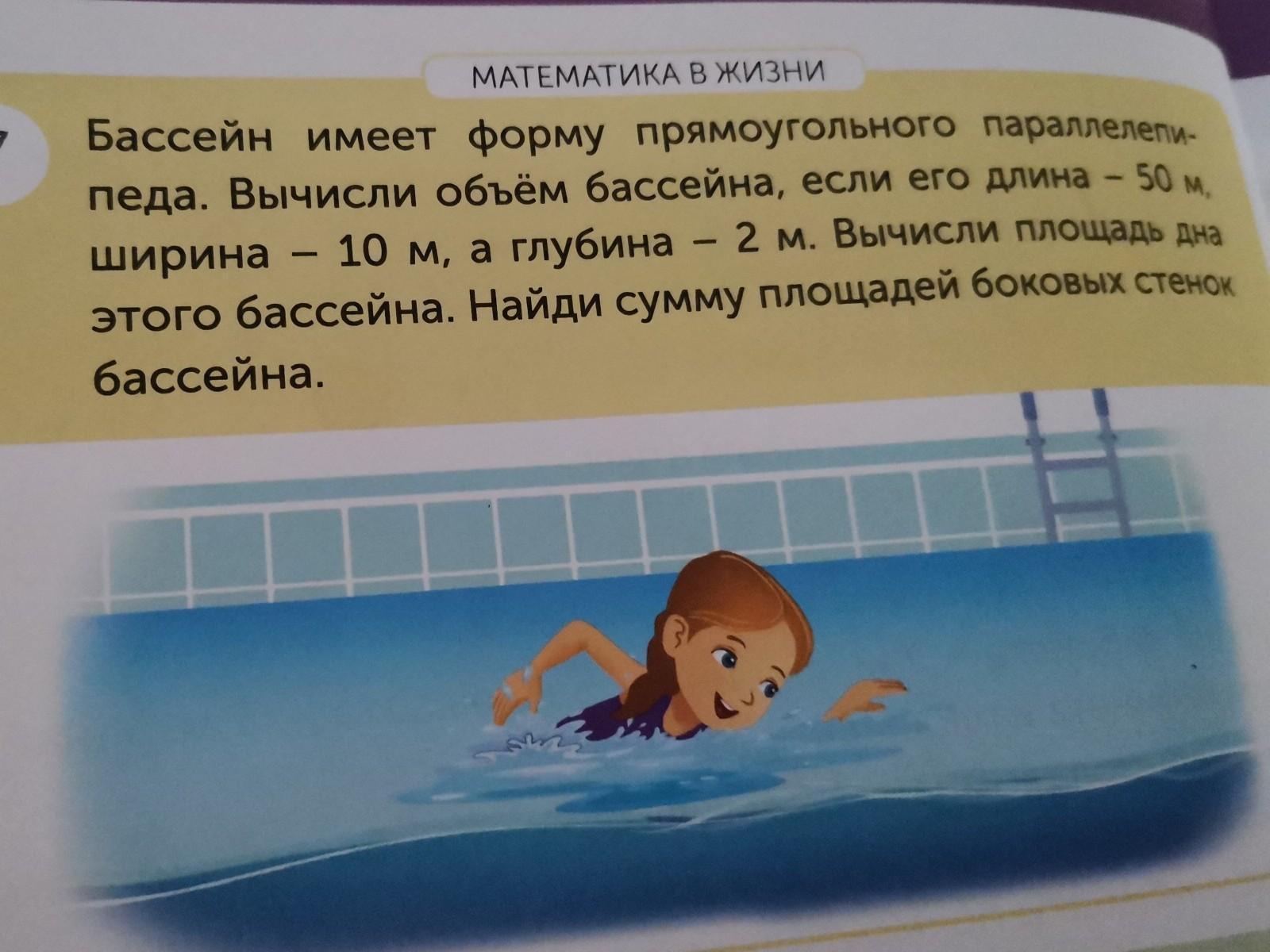 Бассейн имеет форму прямоугольного параллелепипида вычисли объём бассейна, если его длина-50м ширина-10м, а глубина-2м вычисли площадь дна этого бассейна. Найди сумму площадей боковых стенок бассейна