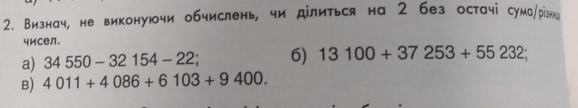 а) 2. Визнач, не виконуючи обчислень, чи ділиться на чисел. a) 34 550 - 32 154 - 22; 6) 13 100 + 37 253 +55 232; B) 4011 + 4 086 + 6 103 +9 400мпжпжпжпжпжжпж даю 40 БАЛОВ