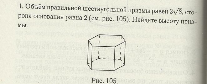 Объем правильной шестиугольной призмы равен 3 корня из 3, сторона равна 2. Найдите высоту призмы