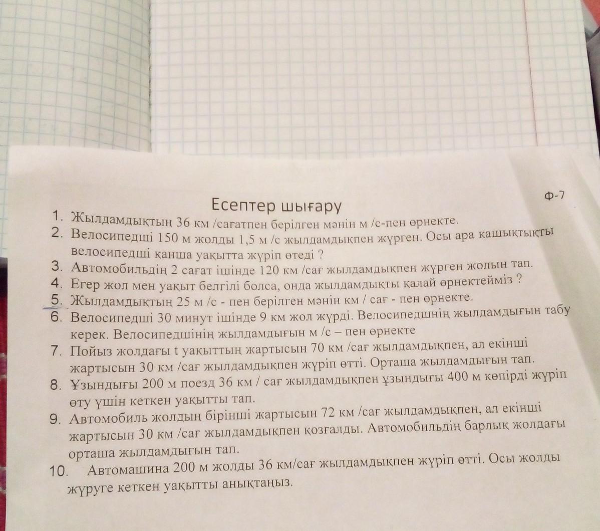 ПЖЖЖ СРОЧНООО Есептер шығару 1. Жылдамдыктың 36 км сағатпен берілген мәнінм /с-пен ориекте. 2. Велосипедші 150 м жолды 1.5 м/с жылдамдықпен жүрген. Осы ара кашлыктыкты велосипедші қанша уакытта жүріп өтеді ? 3. Автомобильдін 2 сағат ішінде 120 км /сағ жылдамдықпен жүрген жолын тап. 4 Егер жол мен уакыт белгілі болса, онда жылдамдыкты калай өрнектейміз? 5 Жылдамдықтың 25 м/с - пен берілген мәнін км / сан - пен өрнекте. 6 Велосипедші 30 минут ішінде 9 км жол жүрді. Велосипедшнің жылдамдыгын табу керек. Велосипедшінің жылдамдығын м/с – пен өрнекте 7. Пойыз жолдағы t уакыттың жартысын 70 км /сағ жылдамдықпен, ал екінші жартысын 30 км /сағ жылдамдықпен жүріп өтті. Орташа жылдамдыгын тап. 8. Ұзындығы 200 м поезд 36 км/сағ жылдамдықпен үзындыгы 400 м көпірді жүріп өту үшін кеткен уакытты тал 9. Автомобиль жолдың бірінші жартысын 72 км /сағ жылдамдықпен, ал екінші жартысын 30 км /сағ жылдамдықпен козгалды. Автомобильдің барлық солдаты орташа жылдамдығын тап. 10. Автомашина 200 м жолды 36 км/сағ жылдамдықпен жүріп өтті. Осы коды жүруге кеткен уақытты анықтаңыз.