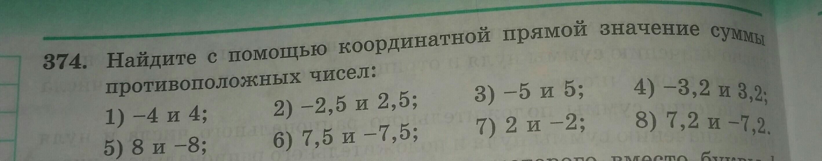 Найдите с помощью координатной прямой значение суммы провоположных чисел 1)-4и4 (2) -2,5и2,5 .(3)-5и5 .(4)-3,2и3,2 .5