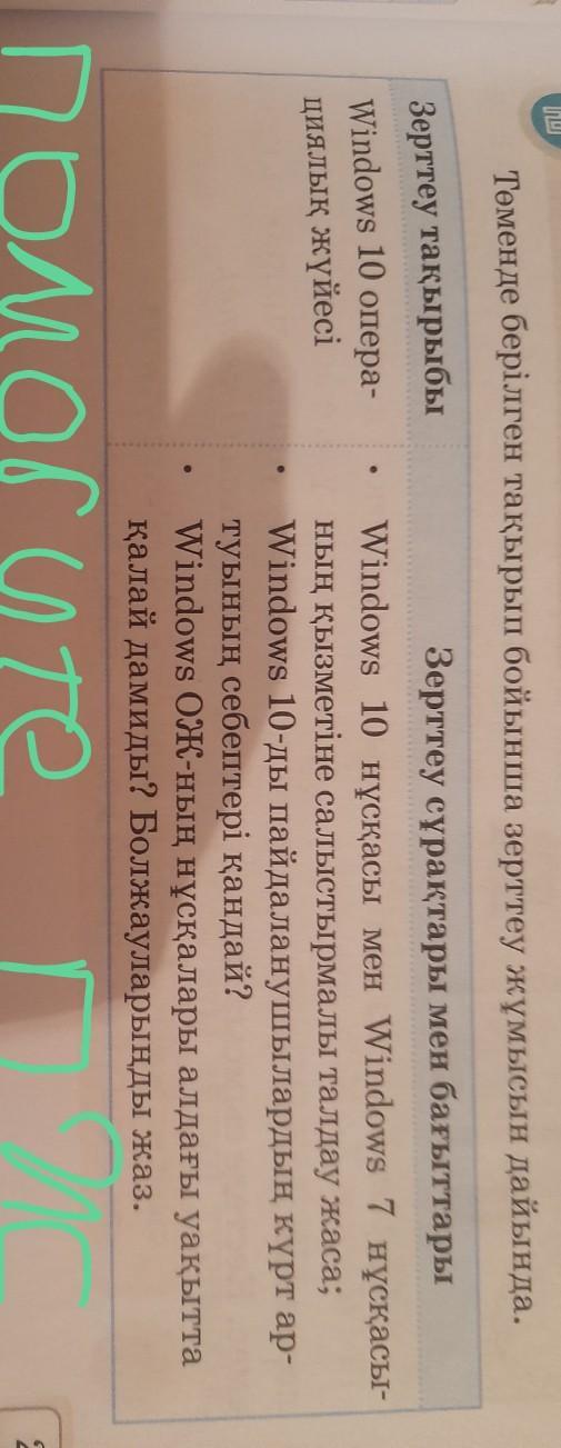 Төменде берілген тақырып бойынша зерттеу жұмысын дайында. Зерттеу тақырыбы Windows 10 опера- циялық жүйесі Зерттеу сұрақтары мен бағыттары Windows 10 нұсқасы мен Windows 7 нұсқасы- ның қызметіне салыстырмалы талдау жаса; Windows 10-ды пайдаланушылардың күрт ар- туының себептері қандай? Windows ОЖ-ның нұсқалары алдағы уақытта қалай дамиды? Болжауларыңды жаз.