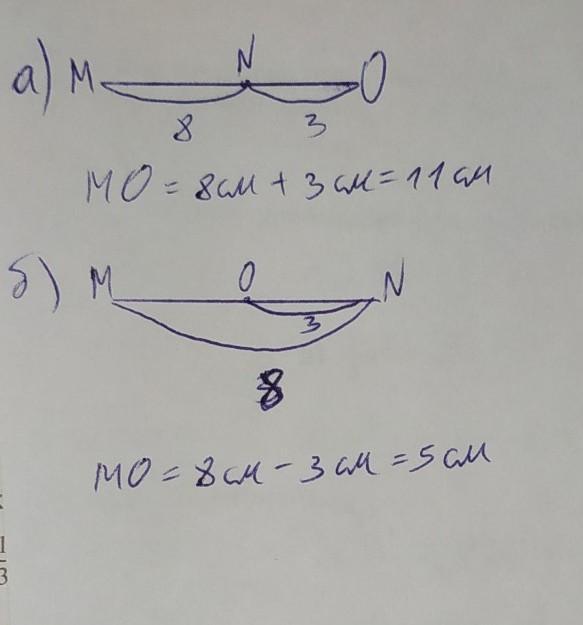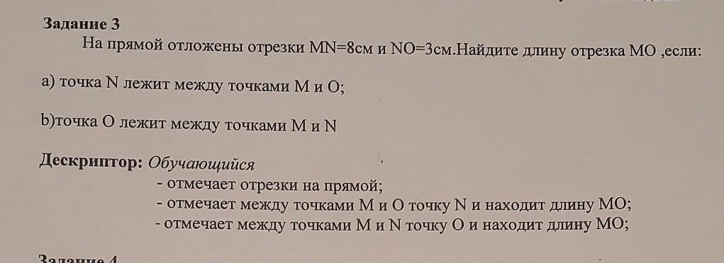 Задание 3 На прямой отложены отрезки MN=8см и NO=3см.Найдите длину отрезка МО ,если: а) точка Nлежит между точками Ми 0; b)точка 0 лежит между точками Ми N Дескриптор: Обучающийся - отмечает отрезки на прямой; - отмечает между точками Ми 0 точку N и находит длину MO; - отмечает между точками МиN точку Ои находит длину MO;