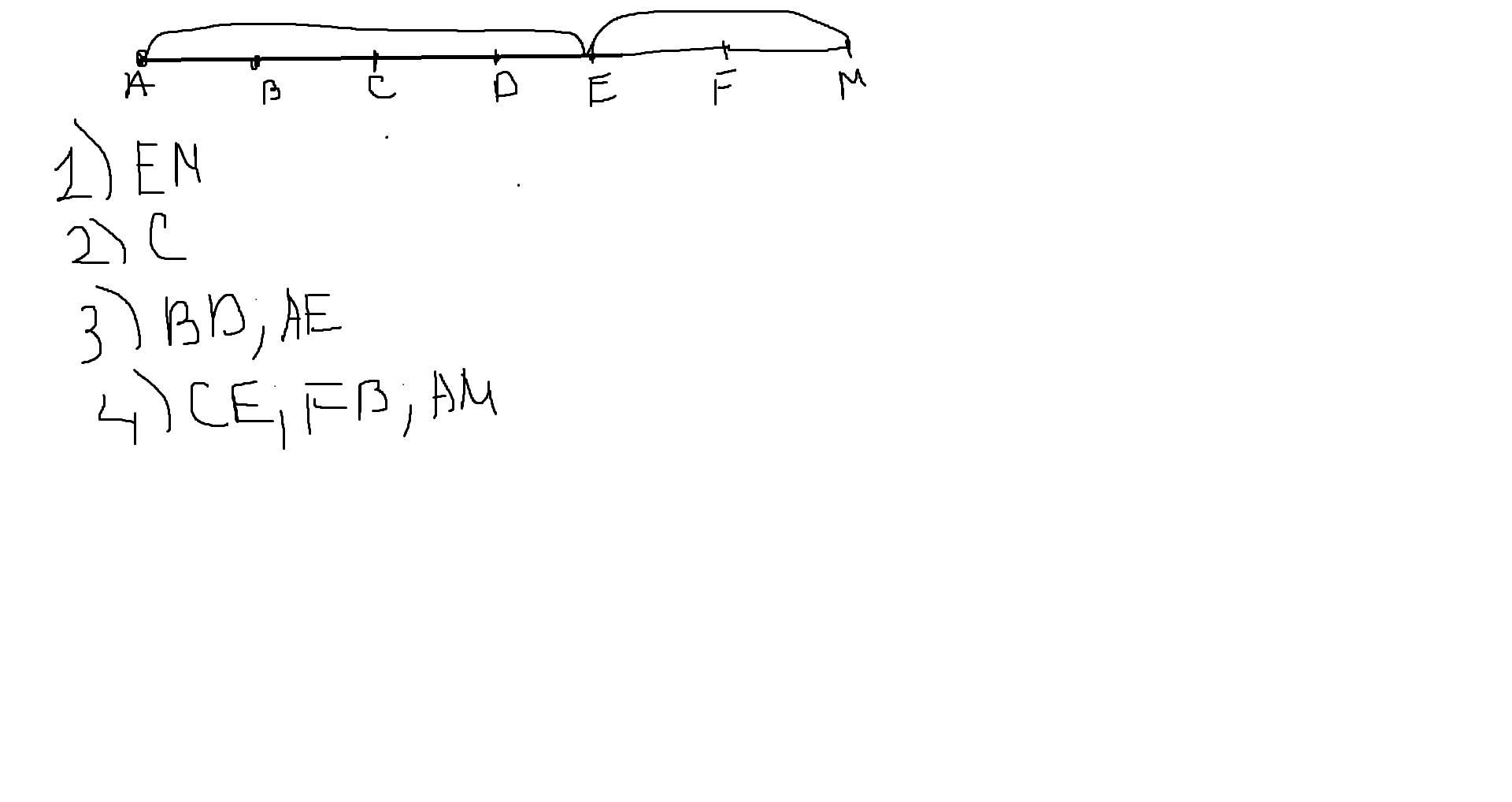 Известно, что AB = ВС = СD=DE = EF=FM Закончите предложения. 1) Точка F является серединой отрезка 2) Серединой отрезка АЕ является точка 3) Точка С является серединой отрезков 4) Точка D является серединой отрезков