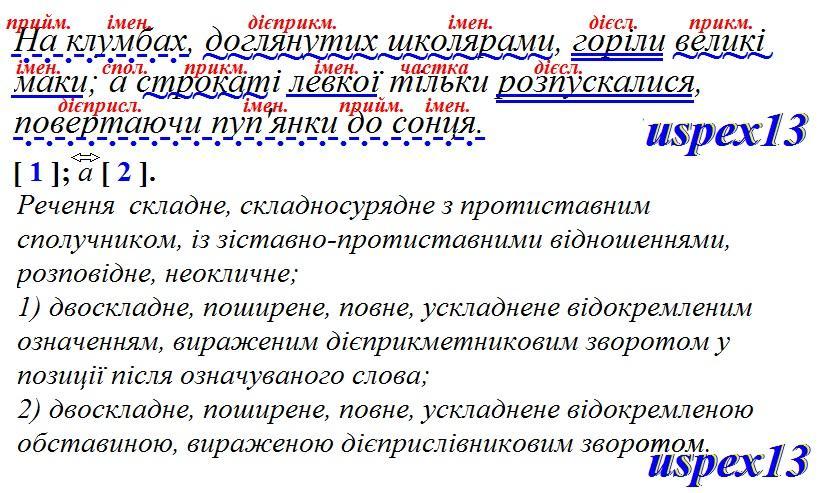 Виконай синтаксичний розбір речення (підкресли члени речення, надпиши над кожним словом назву частини мови, дай загальну характеристику всій конструкції і одному компоненту як простому реченню, побудуй структурну схему). На клумбах, доглянутих школярами, горіли великі маки; а строкаті левкої тільки розпускалися, повертаючи пуп'янки до сонця.