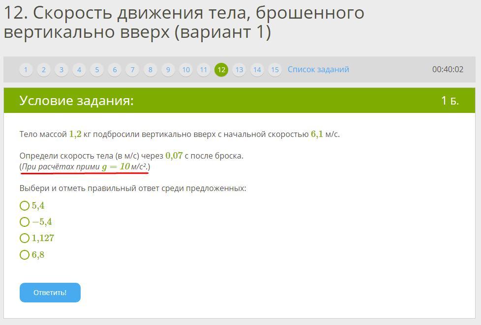 v=vo-g*t=6.1-10*0.07=5.4 м/с