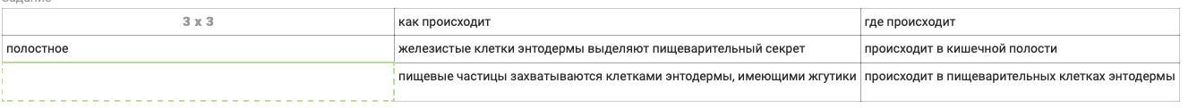 Рассмотрите таблицу "Пищеварение у гидры" и вставьте пропущенное слово в пустую ячейк