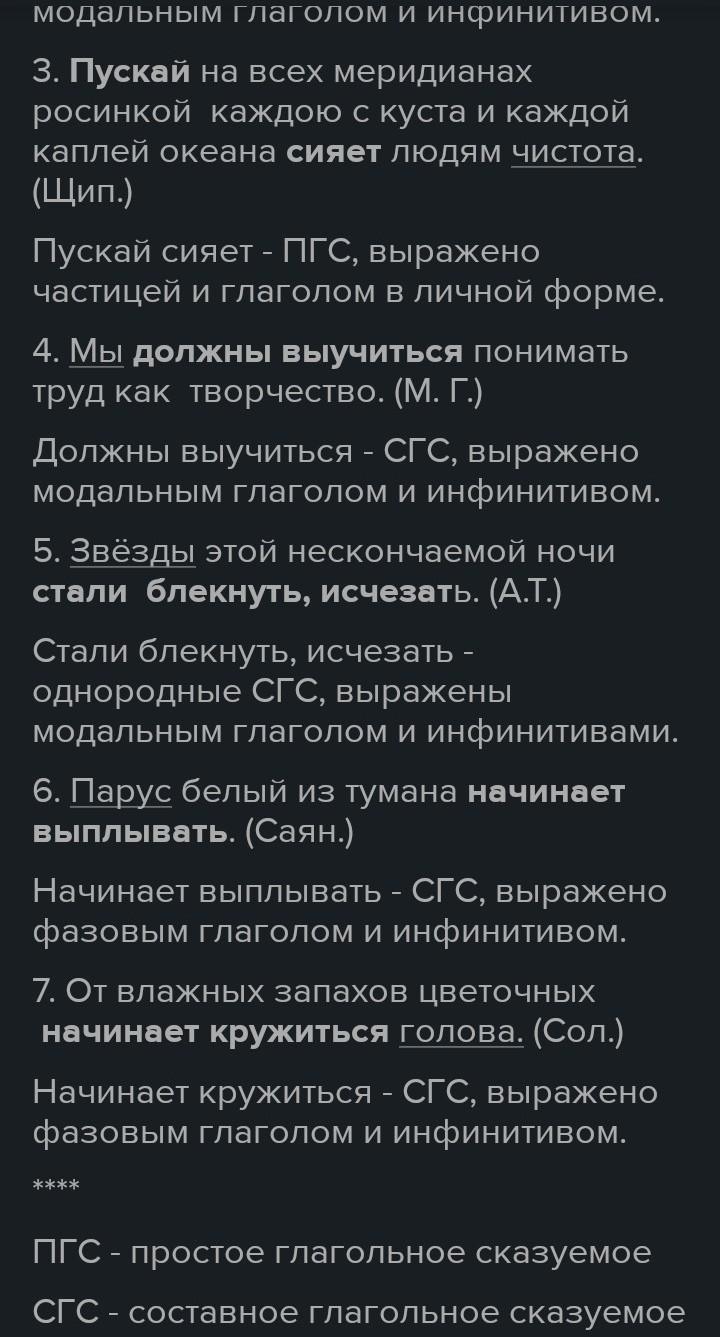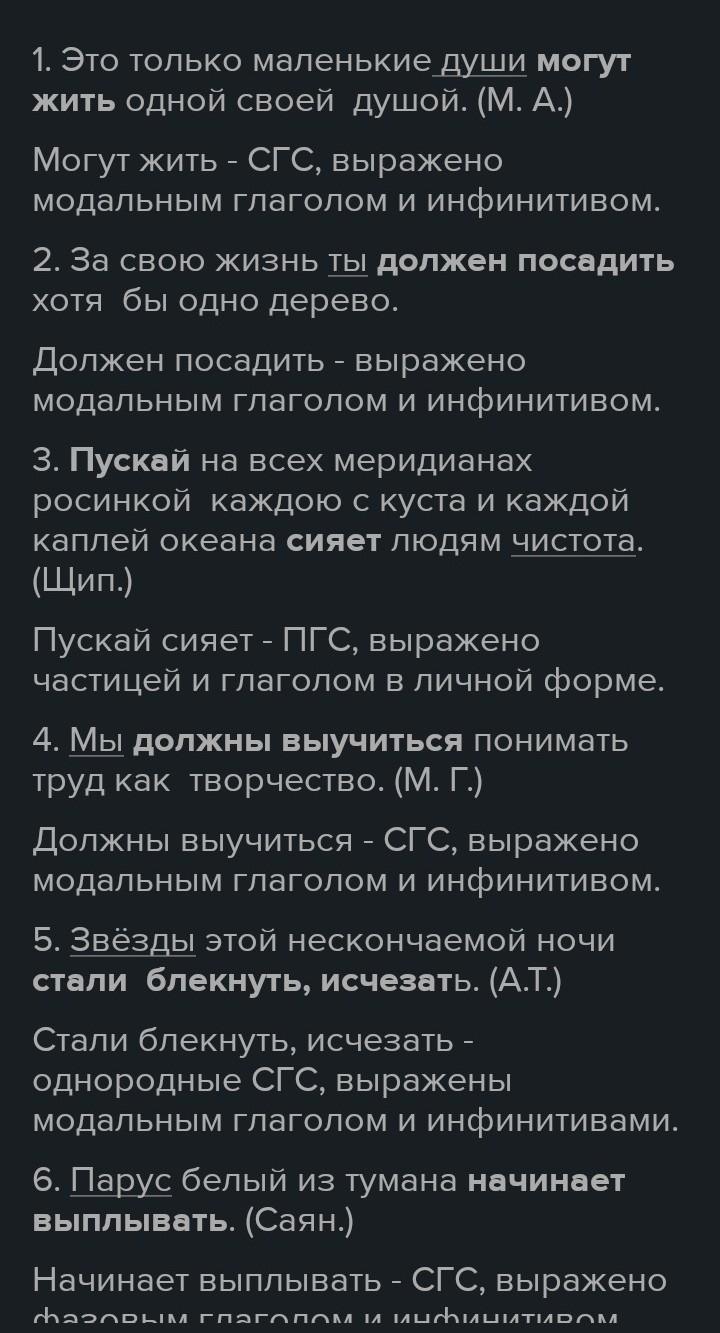 Спишите предложения, подчеркните сказуемые, определите их вид и структуру. 1. Это только маленькие дупши могут жить одной своей душой. (М. А.) 2. За свою жизнь ты должен посадить хотя бы одно дерево. 3. Пускай на всех меридианах росинкой каждою с куста и каждой каплей океана сияет людям чи- стота. (Щип.) 4. Мы должны выучиться понимать труд как творчество. (М. Г.) 5. Звёзды этой нескончаемой ночи стали блекнуть, исчезать. (А.Т.) 6. Парус белый из тумана начи- нает выплывать. (Саян.) 7. От влажных запахов цветочных начинает кружиться голова. (Сол.)