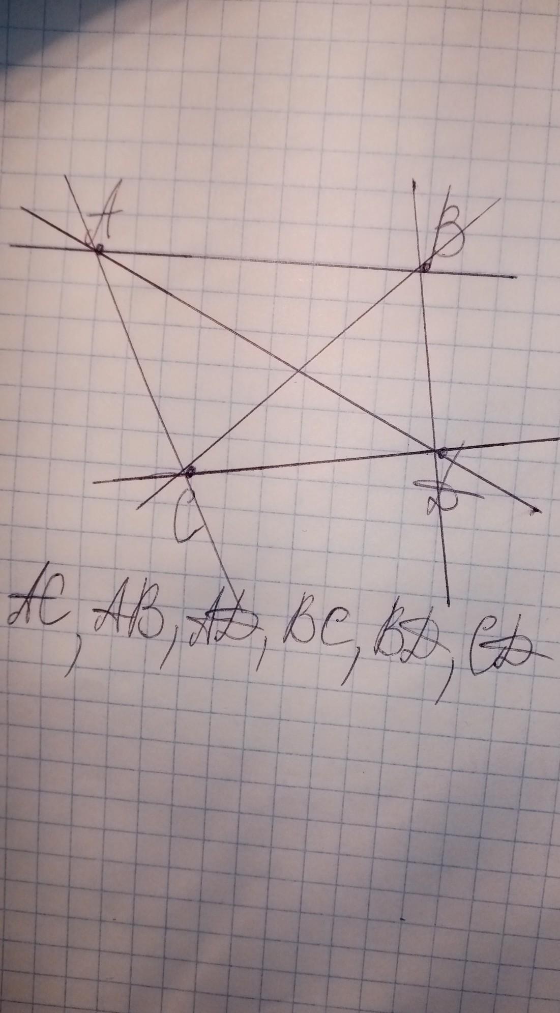 Ответ: АС, АВ, АD,ВС,ВD,СD.