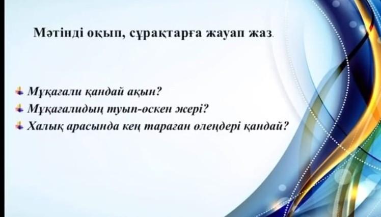 1. Мұқағали- қазақтың лирик ақыны, мұзбалақ ақын, ақиық ақын.