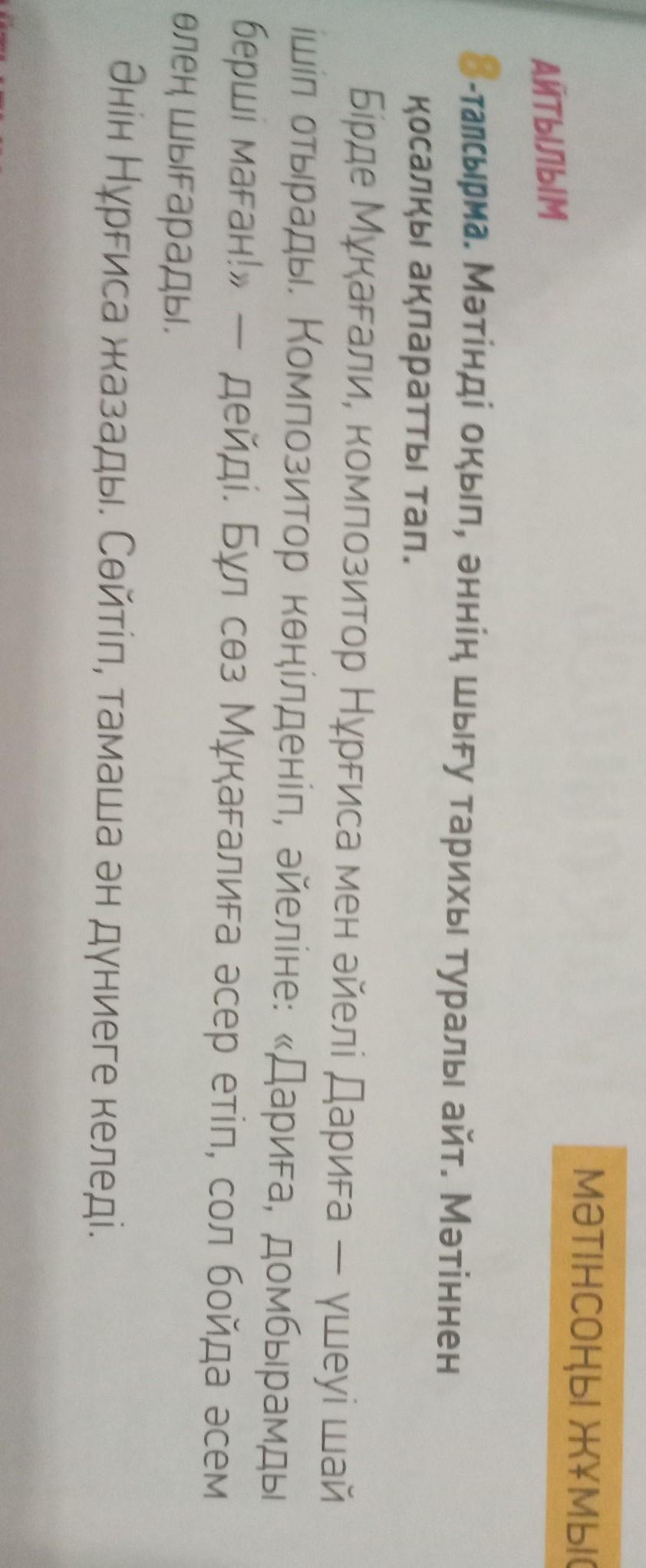 Мұқағали Мақатаев Композитор Нұрғиса мен Дариға екеуі шай ишип ангимелесип отырган Коспозитор аегемелесип отырган кезде конили котерилип Әйеліне былай дейди: Дариға менин домбырамымда берши дейди.БУЛ создері Мүқағалиға әсер етип бир олен шыгаратын болады. Ал әнинди Нұрғиса шығарған екен. Мөйтип бул окигадан кейин керемет ән дүниеге келген екен все
