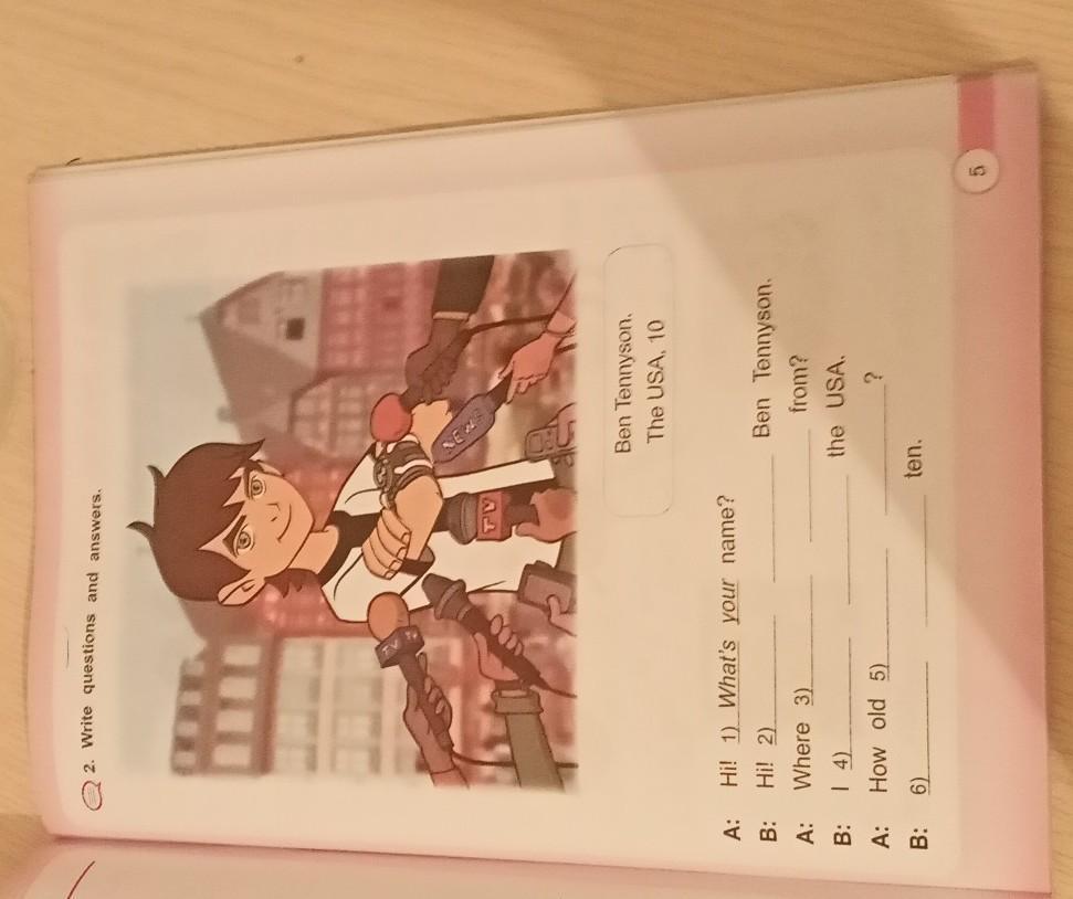 2. Write questions and answers. NEWS TV Ben Tennyson. The USA, 10 A: Hi! 1) What's your name? B: Hi! 2) Ben Tennyson from? the USA A: Where 3) B: | 4) ? A: How old 5) ten B: 6)