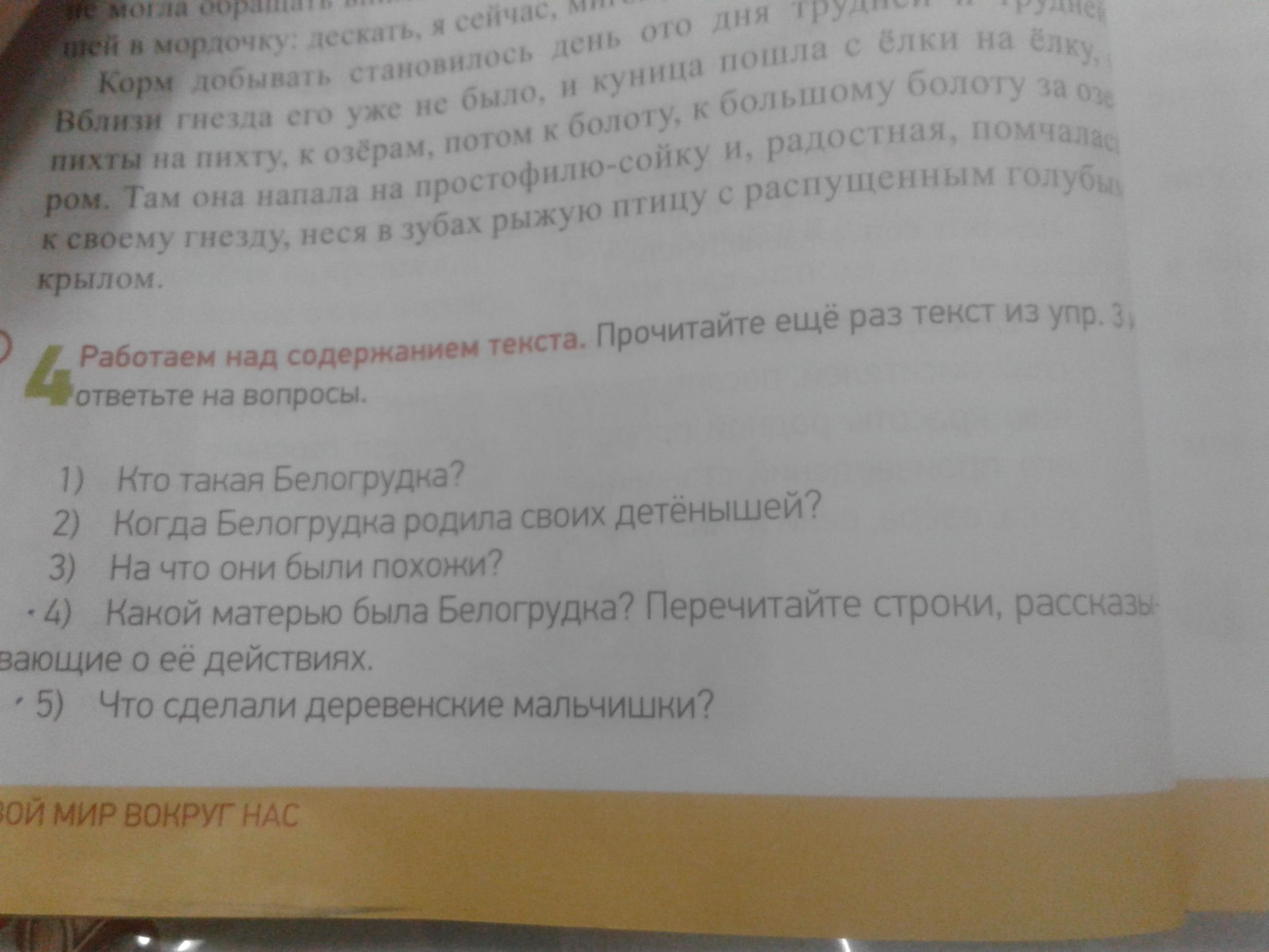 5. Мальчишки из деревни Вереино унесли для забавы из гнезда котят куницы Белогрудки. Обезумевшая мать-куница прибежала в деревню, видела, как сдохшего котенка бросили собаке. Она мстила людям: убила их гусят и утят. Взрослые сказали мальчишке вернуть котят в гнездо, а он оставил их в овраге на съеденье лисе. Белогрудку застрелили. Но с того времени детям запретили брать детенышей из гнезд.