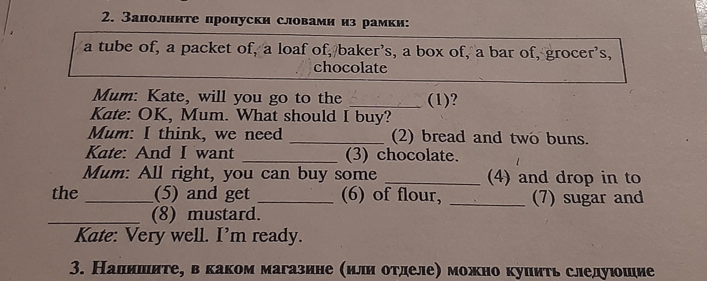 1 grocer's; 2 LOAF OF; A BAR OF; 4 CHOCOLATE; 5 BOX;6 PACKET 7 BAKERS; 8 TUBE